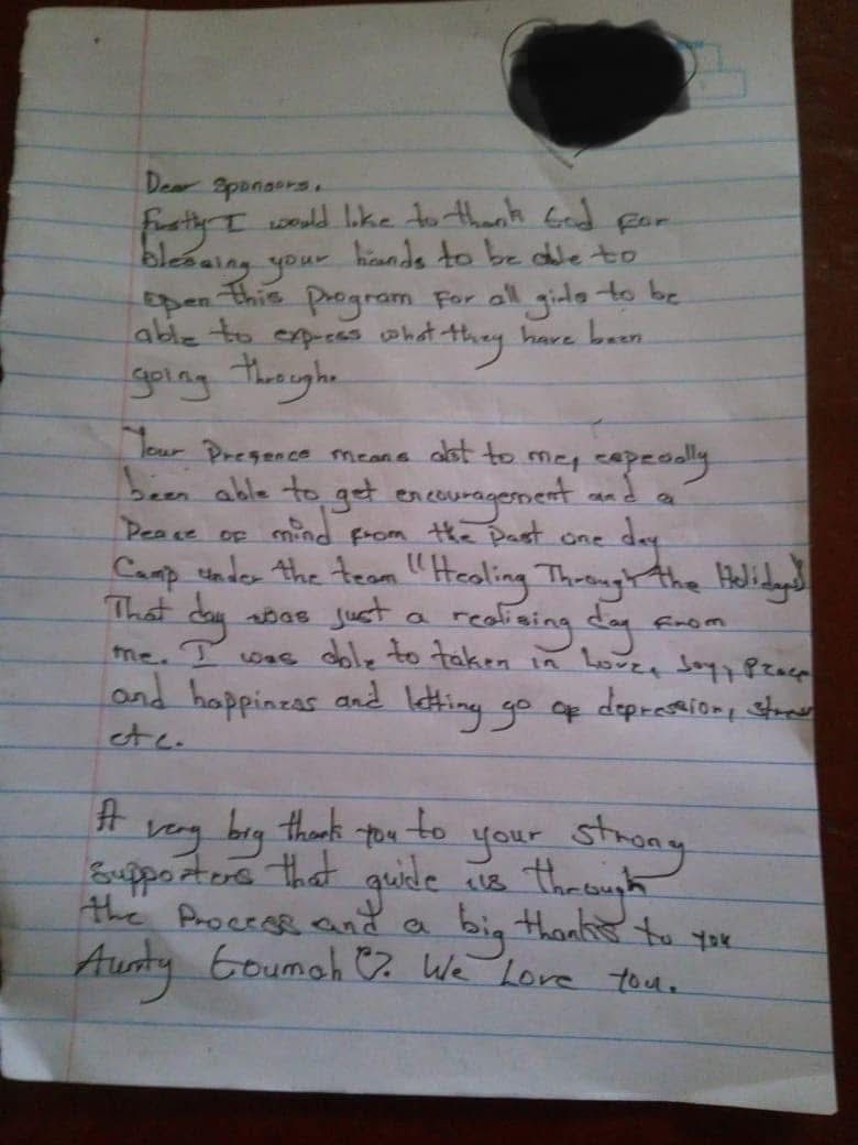 The camp titled “Healing Through The Holidays” was a therapeutic success. A total number of 60 girls attended the camp. We had 7 support staffs on deck, including 6 volunteers and 1 paid staff.