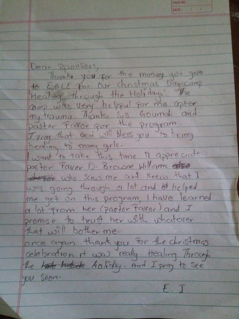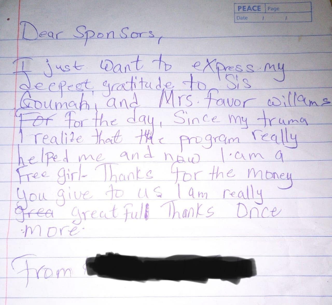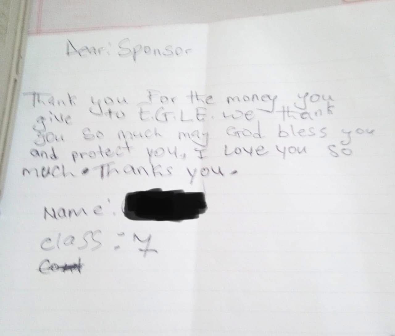 As you read the handwritten notes from our girls, please offer grace for the spellings. Many of our girls are just receiving the opportunity to enter better schools. That is something that we have also been working on. We currently pay tuition for 5 students. We welcome sponsorship for more EGLE girls. Please inbox us if you are willing to help in that area. We will put you in touch with the schools.